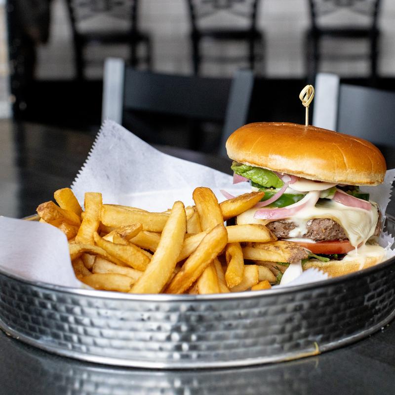 1/2 lb burger patty with mixed greens, Swiss cheese, sliced tomato, pico de gallo, and guacamole, on a brioche bun.