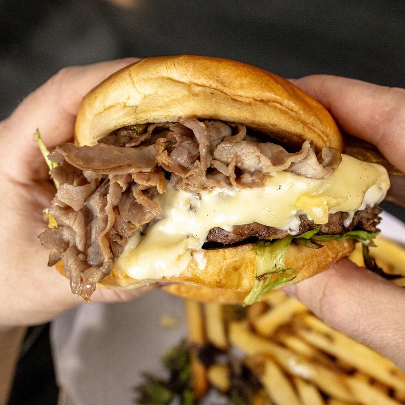1/3 lb burger patty topped with chili steak, green peppers, onions, and mushrooms, topped with queso cheese.