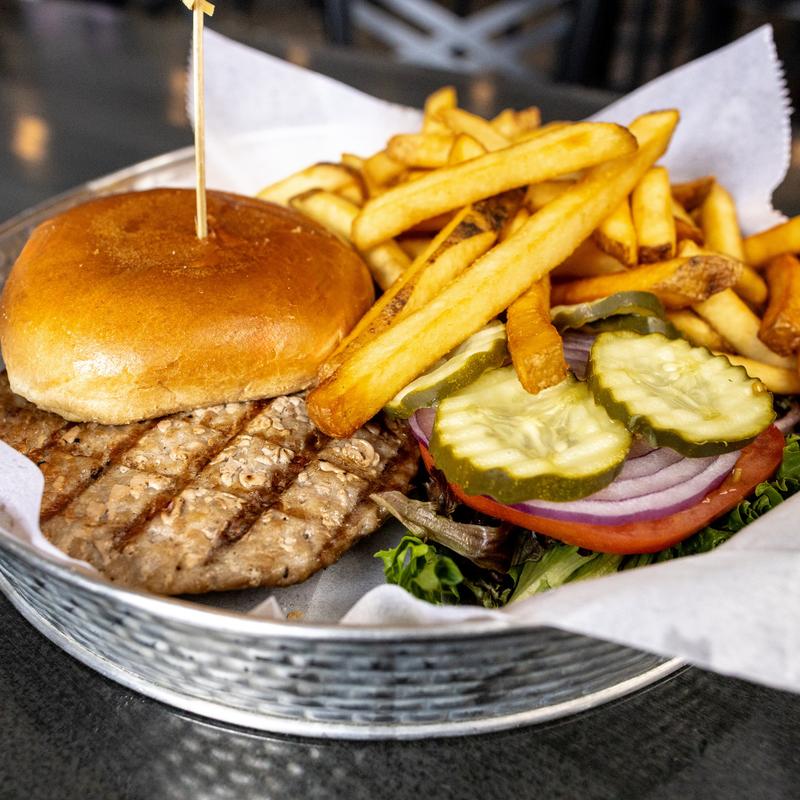 Our signature burger with a choice of cheese, lettuce, tomato, onion, and pickle. Toasted brioche bun.