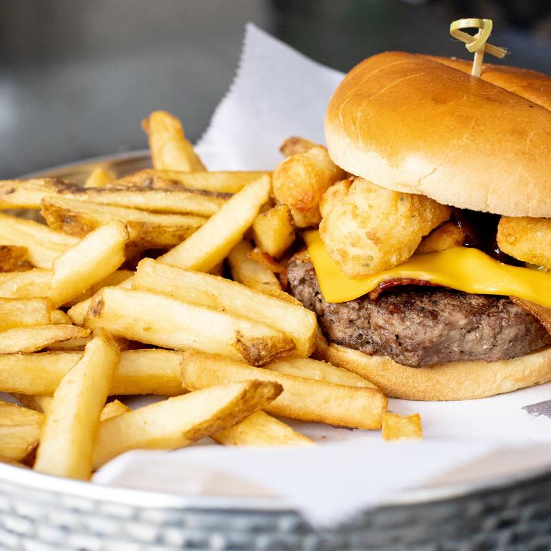 American cheese, double-smoked bacon, mac attack bites, pub cheese sauce, and toasted brioche bun.