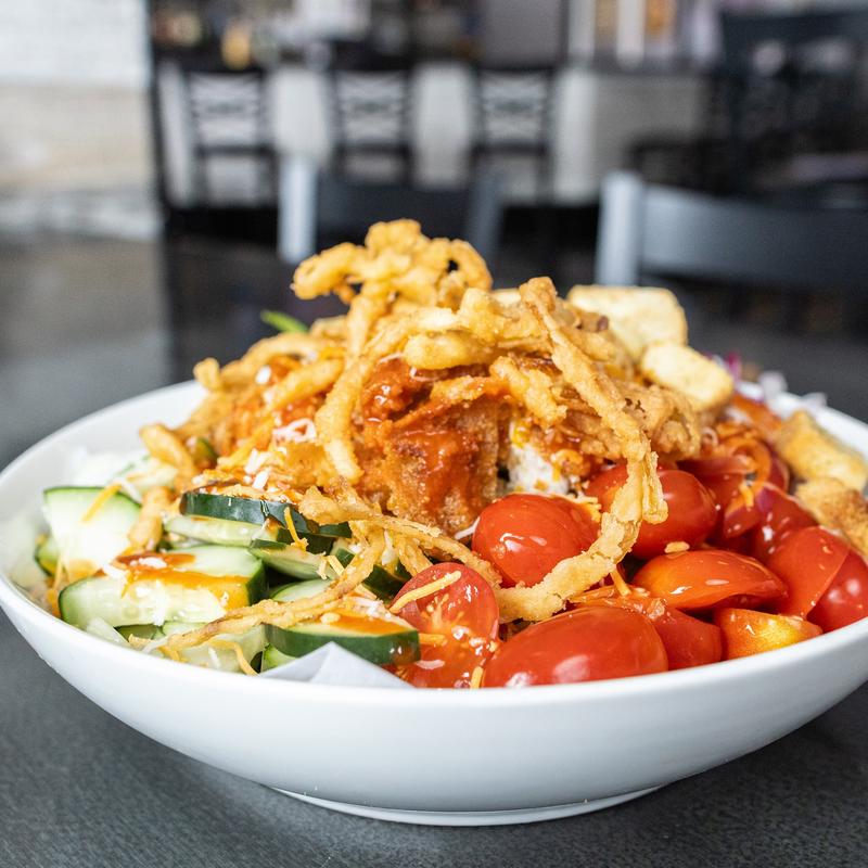 Breaded chicken breast, buffalo sauce, mixed greens, tomato, cucumber, cheddar-jack cheese, fried onion straws, buffalo, and house ranch drizzle.