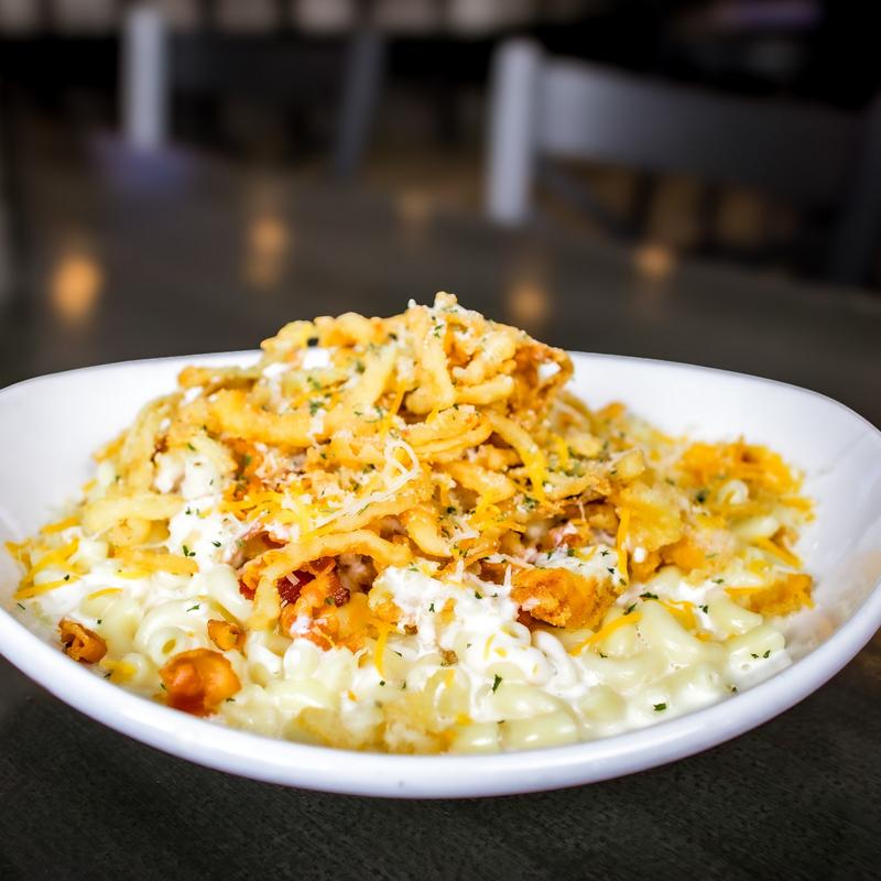 White cheddar mac and cheese, topped with breaded chicken, chopped bacon, onion straws, parsley, and parmesan crumbs, drizzled with ranch.