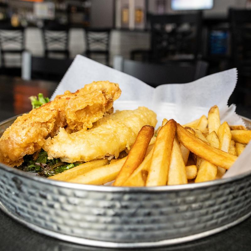 Beer-battered cod fillets, fries, house coleslaw, tartar sauce, and lemon wedge.